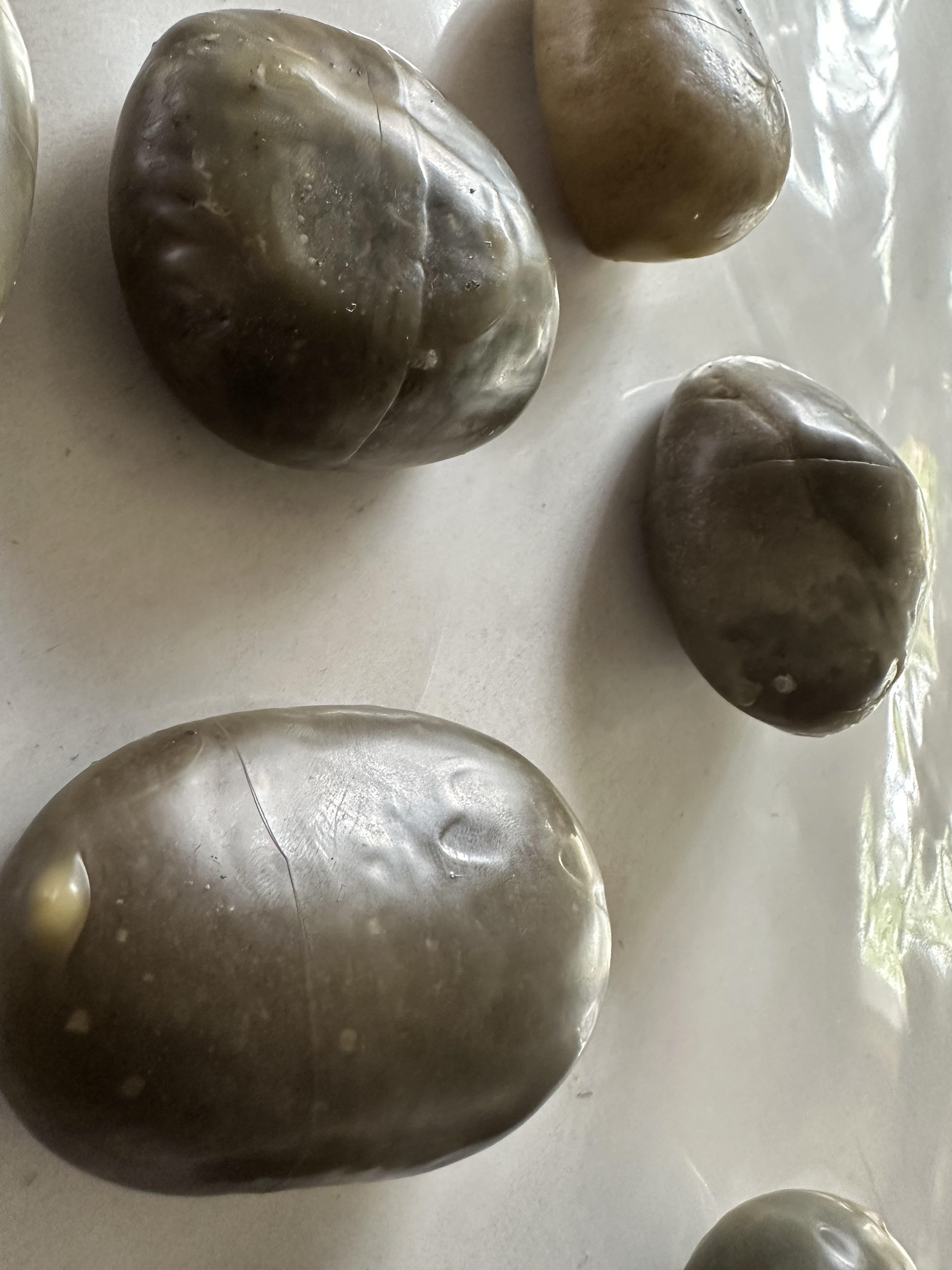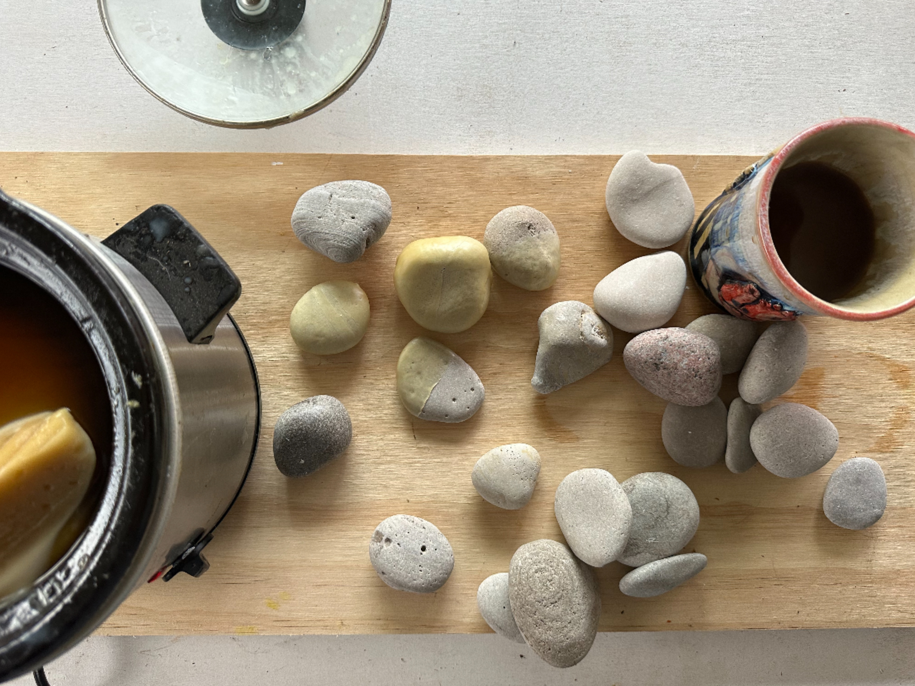 The making of an asteroid. In my practice I collaborate with materials from the past, present and future. When the stones are warm they become one with the beeswax, absorbing the wisdom of the mother bee. I place the smaller stones in melted beeswax letting it envelple them, warming them from the outside. I hold them leaving my own traces and joining them in becoming something new. When the stones are big and heavy they need to be warmed from the inside otherwise the wax sits on the surface and crumbles. My favourite way to do this is with a warm fire. Sometimes we have to make do with the tools around us. If we can quiet our minds and shift our perspective, there are new universes to be found all around us.