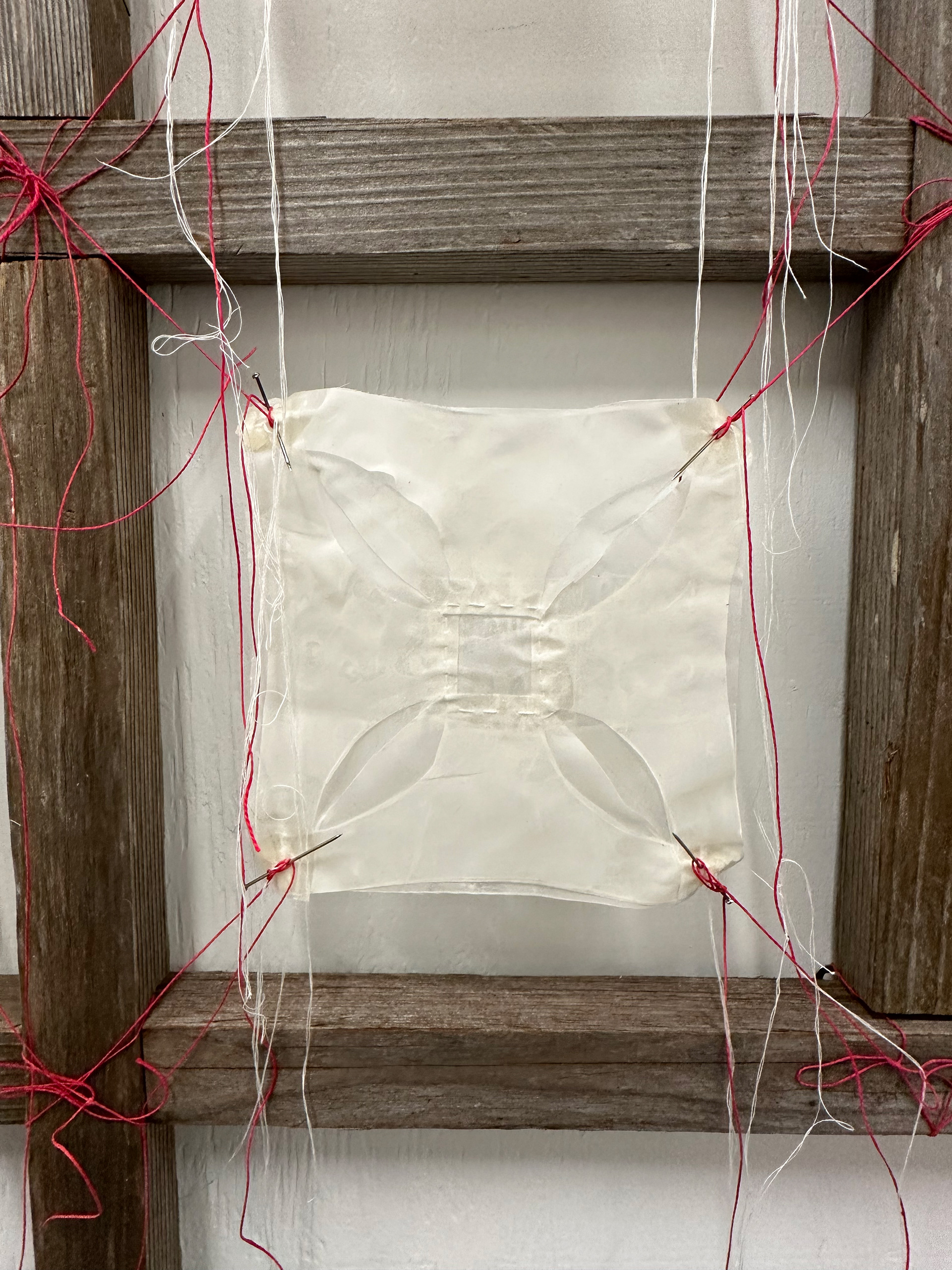 A deconstructed quilt with suspended quilt squares attached with tangled and hanging threads. It speaks of time, the body and the complicated history that we inherit