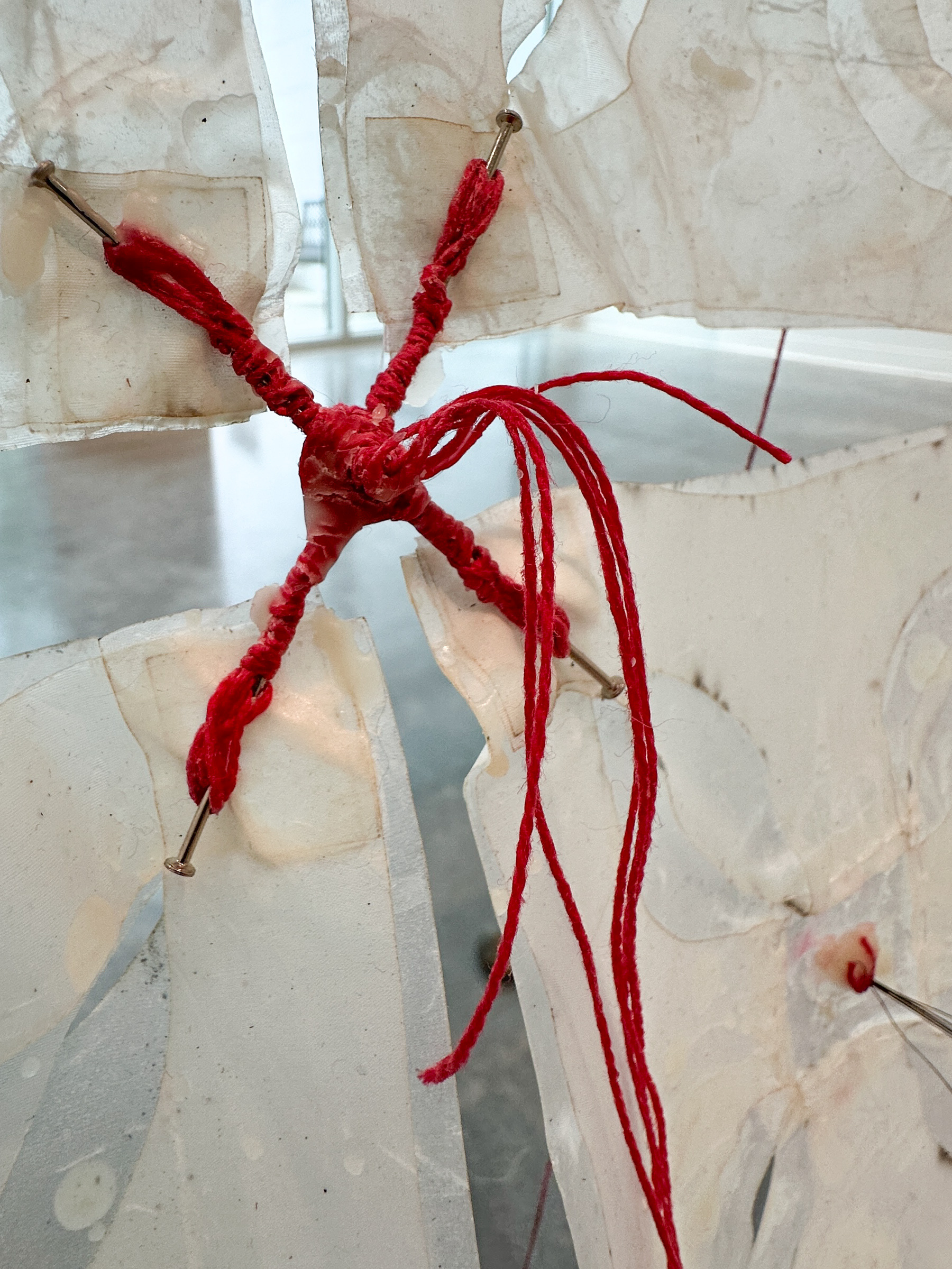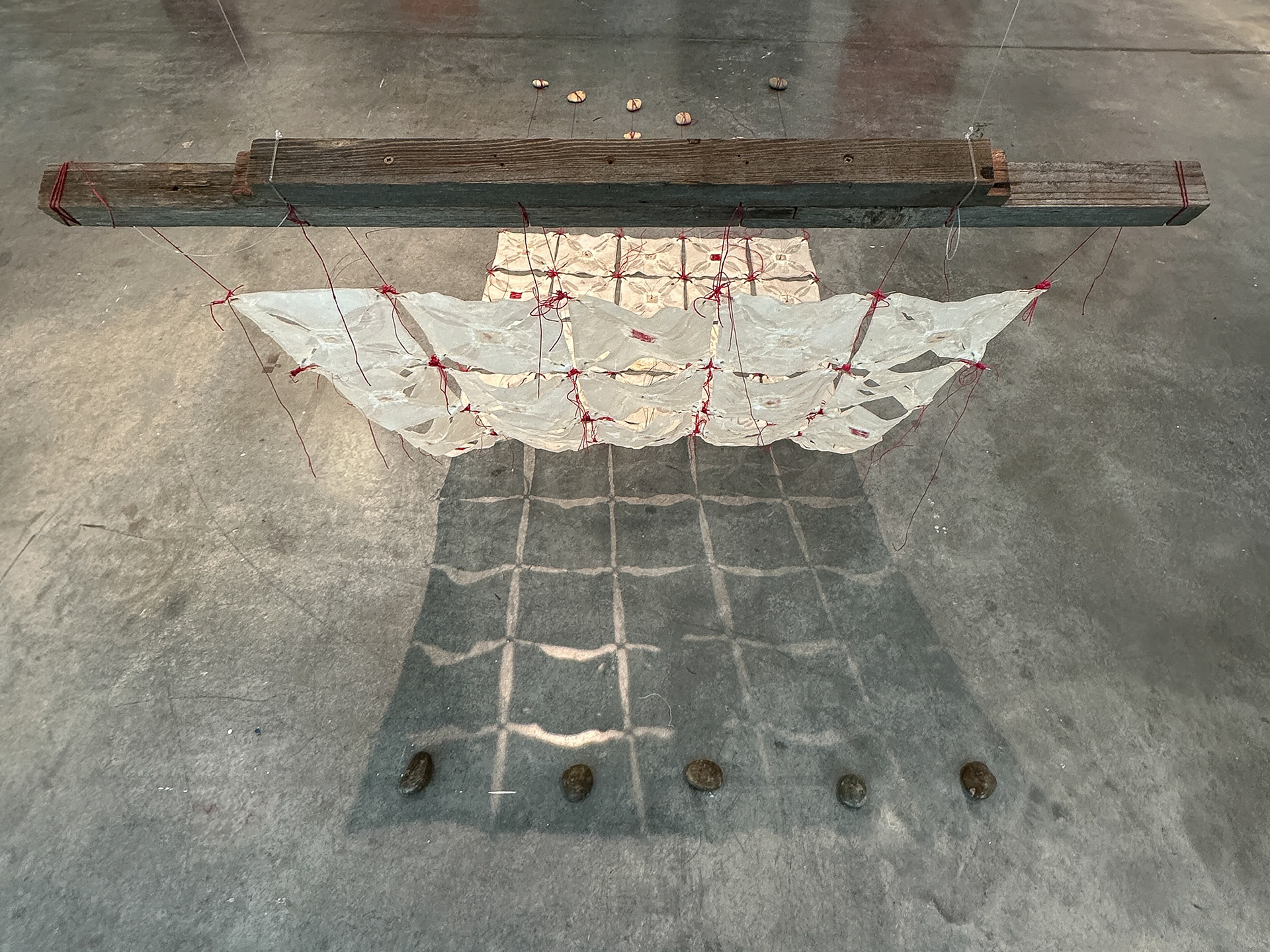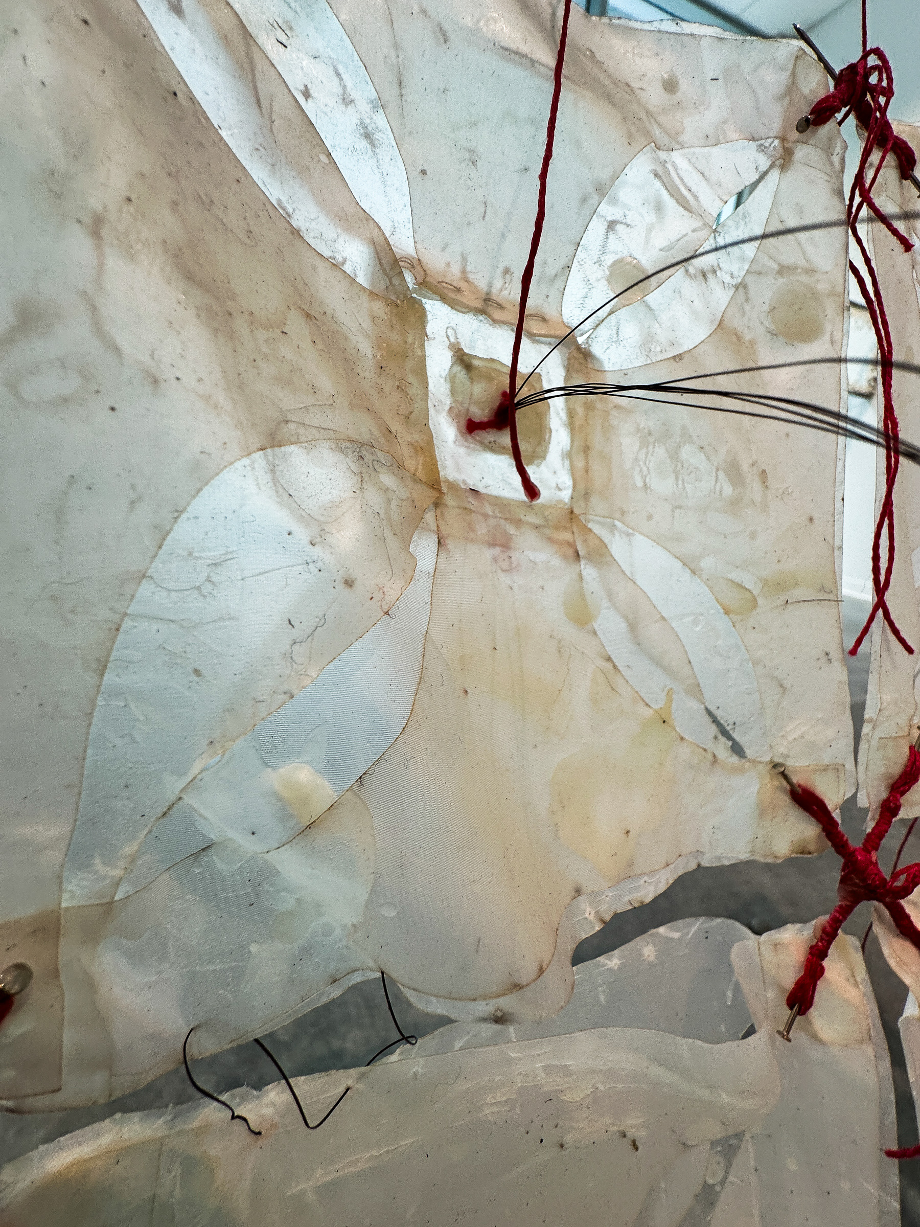 Beeswax, embroidery thread, silk, reclaimed cedar posts, pins, horsehair. .