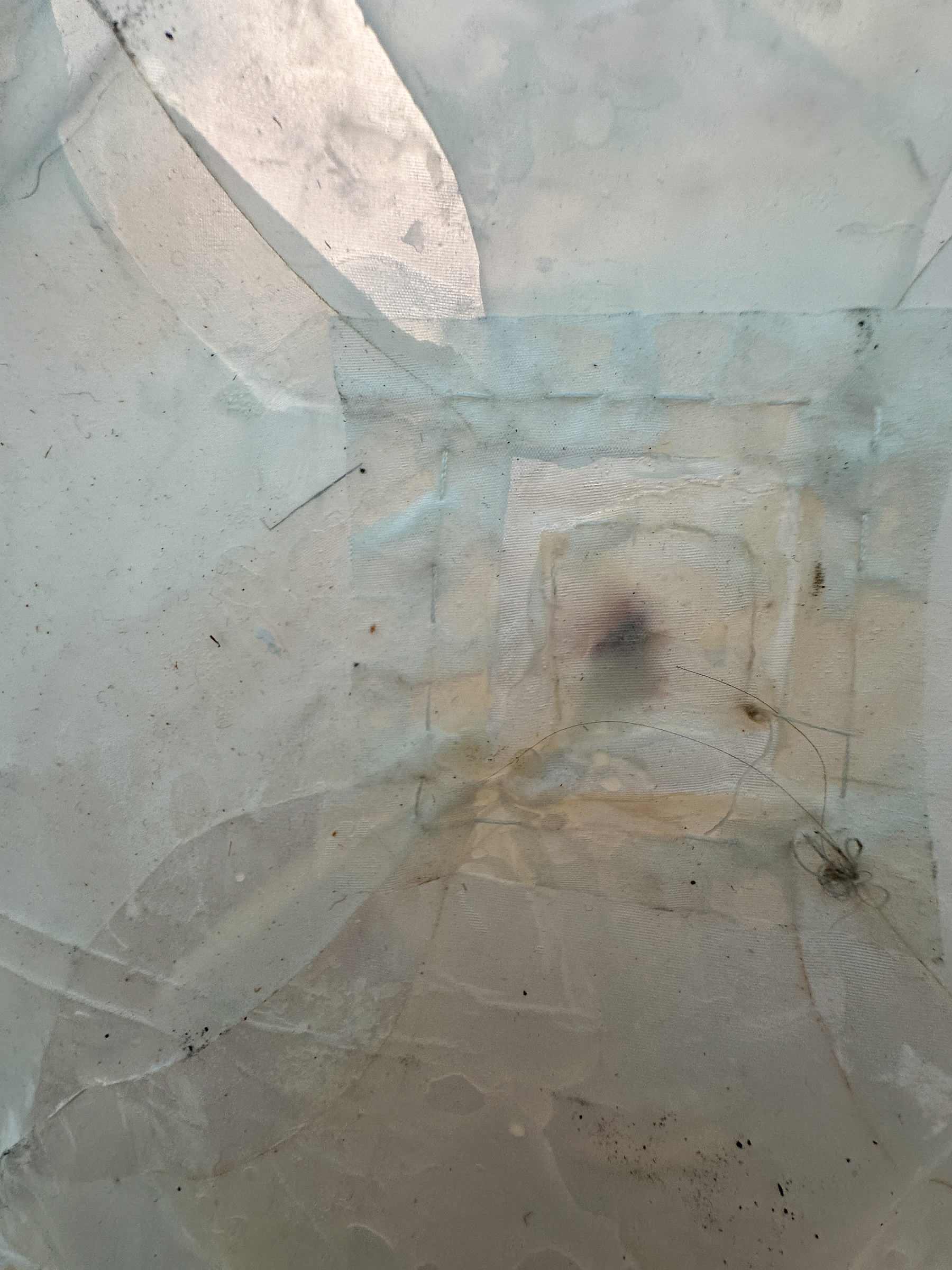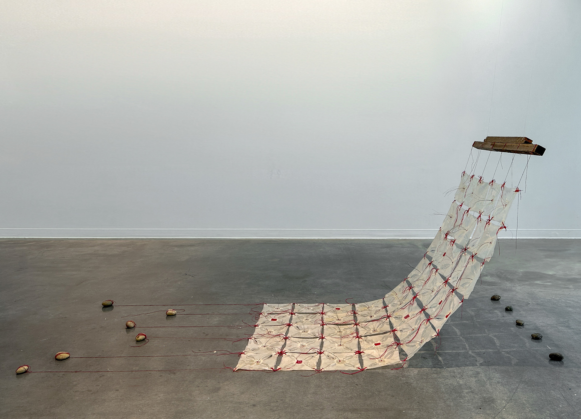How we carry ourselves reflects both the external and internal states of being. Position and Disposition can be installed in many ways, vertically, horizontally or somewhere in between as it is here. Each posture and position offer a different lens through which to engage with the work, shifting the conversation between the materials, the body and the environment. As it slides from one plane to another it transitions from being a quilt that covers the body to becoming a body itself. Visual references to skin, hair, blood, and underwear emerge, evoking both intimacy and legacy. The work speaks to unknown ancestral stories passed through generations — stories that may resurface through behavior, illness, or instinct. Craft and nature here become both a healing balm and a connective thread through time.