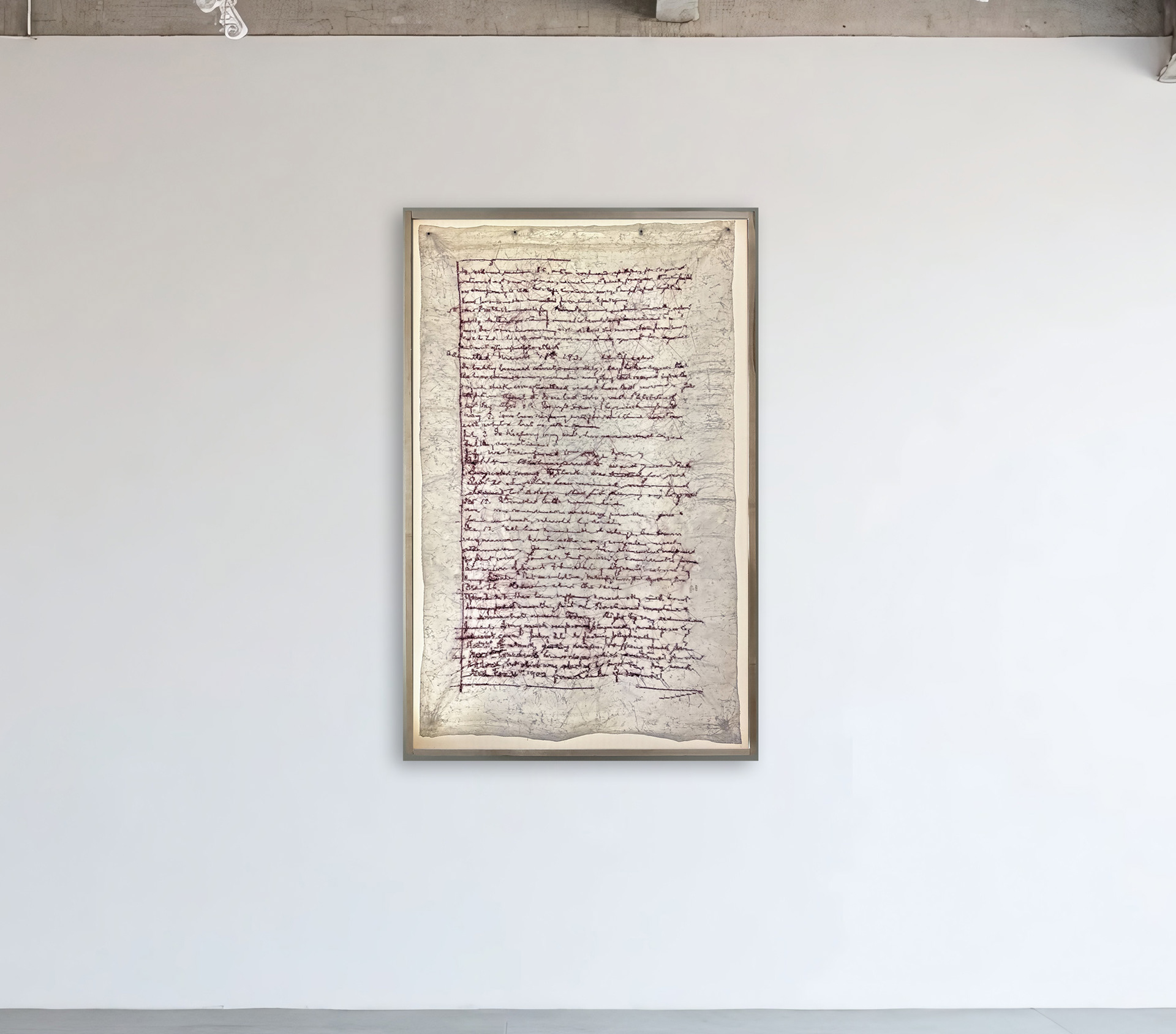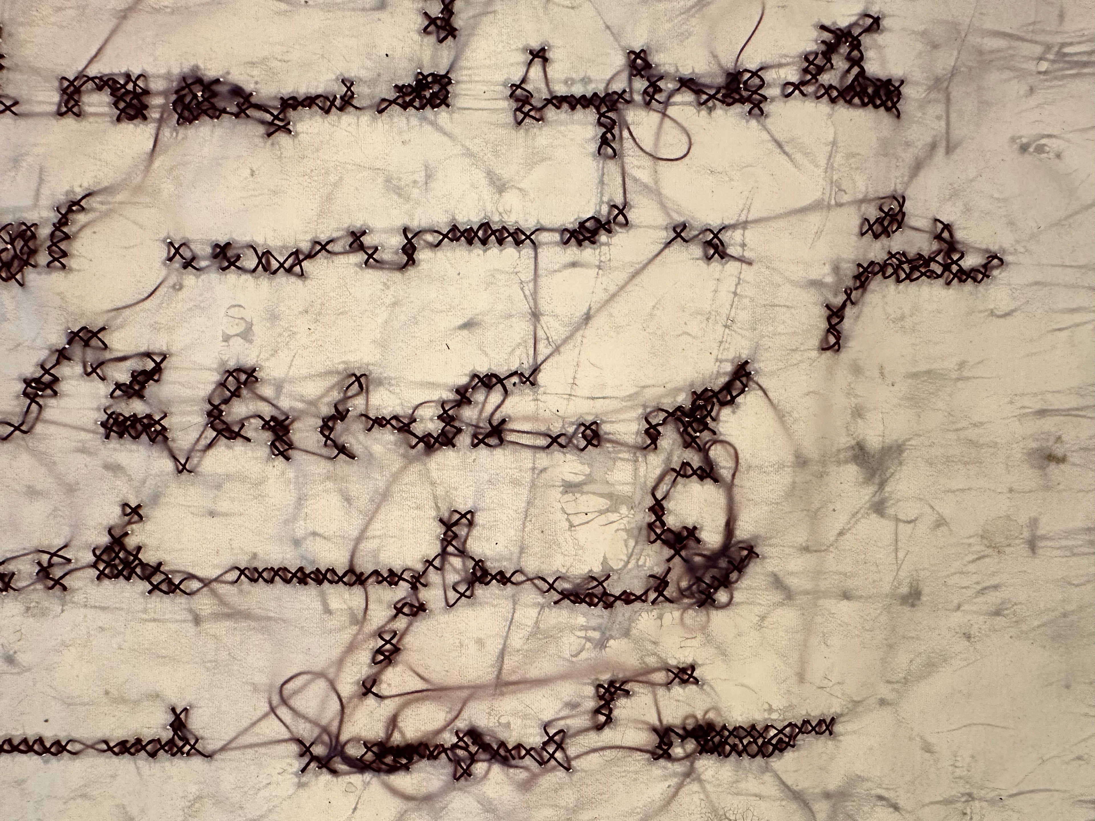 I stitch upside down, without reference. The marks are not legible words, but form patterns and abstract shapes guided by memory rather than exact reproduction. As I stitch, I light the perforated waxed silk from below so the tiny pinholes and cracks in the wax are illuminated. The process takes longer than I anticipate. When fatigue sets in, I resist the urge to stop, instead I settle into the rhythm, stretching my arm as I pull the thread. My body moves while my mind drifts, allowing me to work through that which remains inaccessible to conscious thought.